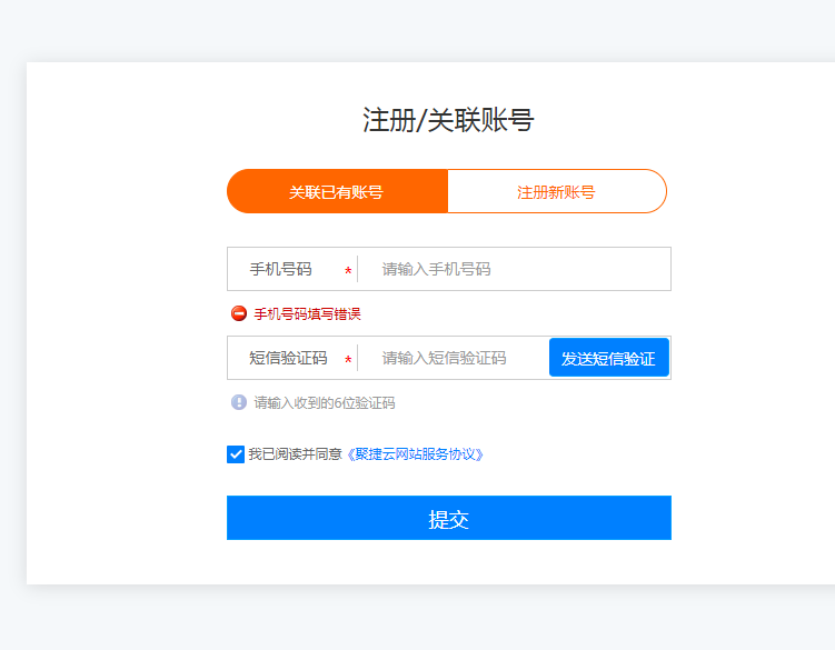 以前注册过聚捷云的用户首次扫码需要绑定用户,输入手机号和验证码点提交即可绑定